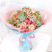 гвоздика персиковая – 5 шт., альстромерия розовая, красная – 4 шт., зелень декоративная (эвкалипт, гипсофила), упаковка, лента.