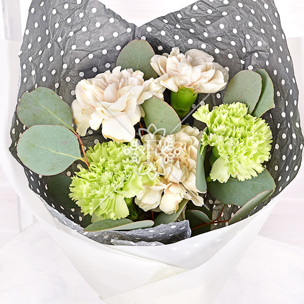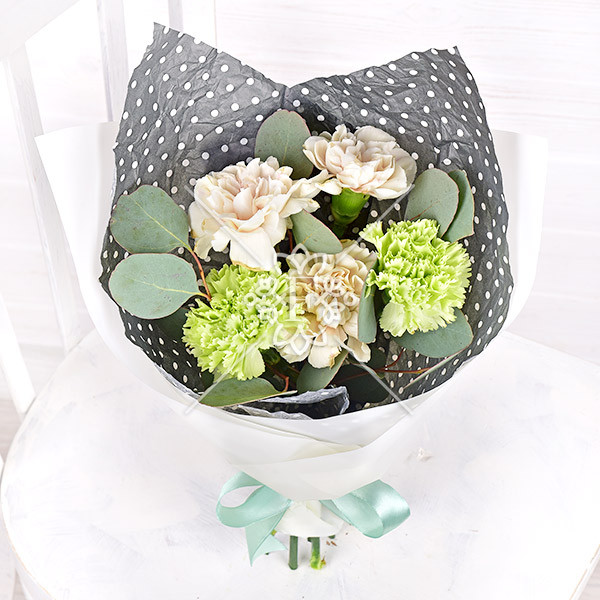 Гвоздика зеленая - 2шт., гвоздика кремовая – 3 шт., зелень декоративная (эвкалипт), упаковка, лента.
