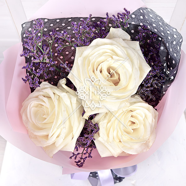 Роза белая - 3 шт., зелень декоративная (лимониум фиолетовый – 1 шт.), упаковка, лента.